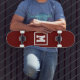 Crie seu próprio skate Modelo vermelho e branco. Adicione facilmente o monograma inicial em cor branca sobre um fundo escuro. escolha o tipo de pavimento no menu de opções.