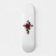 Cruzamento prateado com rosa vermelha e folhas pretas sobre fundo branco.