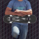 A cruz gótico flamejante com crânios é ajustada em um fundo preto e feita um skate mau.