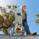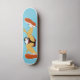 Um tiro por baixo de um skate enquanto uma garota na saia está cavalgando