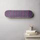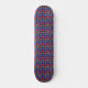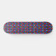 Este brilhante skate de diamante brilhante tem um padrão de abstrato com filas de diamantes vermelhos, azuis claros e azuis escuros nele. Cada fila é separada por uma fila de diamantes negros. Cada um dos diamantes negros tem um buraco no meio dele. O canto superior esquerdo de cada diamante de solteiro parece estar brilhando. Este é um conselho brilhante e de boa qualidade que fará com que todos os seus últimos movimentos pareçam super legal.