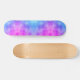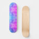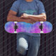 O skate tem um padrão abstrato azul e roxo. O design pode lembrá-lo de gravata.