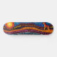 Configuração do Sol - Estilo Aborígene - Deck do skate Aqui está uma descrição de um baralho de skate com trabalho de arte australiano no estilo aborígene, incluindo detalhes sobre arte aborígene: O skate deck é uma canvas impressionante mostrando a vibrante e simbólica arte da cultura aborígene australiana. A arte aborígene é uma das mais antigas tradições artísticas do mundo, namorando há mais de 60 mil anos. Está profundamente ligada à terra, espiritualidade e tradições orais dos povos aborígenes. O design deste baralho é uma fusão impressionante de motins aborígenes tradicionais e de uma arte contemporânea de skate. A peça central é um sol vermelho e amarelo radiante, renderizado no estilo de pintura de pontos distinto sinônimo de arte do Deserto Ocidental. Os raios do sol se estendem para fora, formando um padrão intrincado de círculos concêntricos e crescentos. O oposto do sol é uma representação impressionante de um dingo, um cachorro selvagem reverenciado em histórias aborígene. O corpo do dingo é formado a partir de um caleidoscópio de matizes semelhantes - criado pela antiga técnica de pintura de pontos. Seus olhos parecem segui-lo de todos os ângulos, imbuindo o baralho com um sentido de movimento e vida. As cores vibrantes e os padrões intrincados continuam nos trilhos dos convés e nariz/cauda, incorporando a iconografia aborígena clássica, como o trabalho de linha divisória que representa caminhos e pontos espalhados sugerindo estrelas ou trilhos de animais. Esta obra-prima não é apenas um skate, mas uma celebração da cultura viva mais antiga do mundo. Andar por este baralho é como atravessar uma porta para as ricas tradições narrativas dos Primeiros Povos da Austrália.