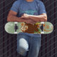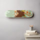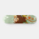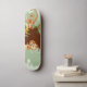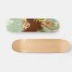 Design de skate em verde e marrom com círculos e elementos gráficos.