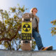 Uma plataforma com o olhar do metal oxidado corrmoído e de um sinal do abrigo de precipitação no centro