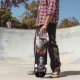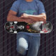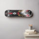 Design do skate com crânio e coroa de cabeça para baixo, chamas, setas e figuras skateboarding pequenas. Igualmente lê do "o skate tambor" com logotipo das BS.