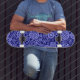 Um skate com design abstrato interessante e diverso que consiste em várias formas circulares em diferentes estilos conectados por linhas finas como uma rede ou um ecossistema.