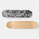 A skateboard with interesting and diverse abstract design consisting of various circular shapes in different styles connected by thin lines like a network or ecosystem.
