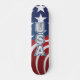 Este skate patriótico tem as estrelas e listras da bandeira americana com texto prateado dos EUA.
