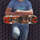 "Busca", um skate que molda o encanto de um Bulldog Francês com a vibração suja da arte digital. No seu coração está um retrato cativante, semelhante à vida, do adorado pooch, seu olhar imbuído de uma personalidade que parece quase tangível. Ao redor desta figura central está um conjunto dinâmico de elementos digitais abstrato—pixels desmontados e reformados em uma tapeçaria de vermelhos, negros e brancos, ecoando a energia bruta da arte urbana de rua. Feito com auxílio da IA, o design em "Busca" despreza as linhas entre tecnologia e beleza orgânica, criando uma canvas rolante que é tanto uma ferramenta para a autoexpressão quanto um testamento para a fusão da arte e da inovação.