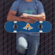 Skateboard with a design with the flag of Shizuoka Prefecture in Japan (静岡県, Shizuoka-ken), a blue flag with a white and yellow symbol