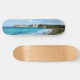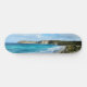 Imagem: longa vista de águas marinhas aquosas se quebrando em areia branca, com penhascos altos e vegetação de praia exuberante em um dia ensolarado e nublado