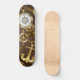 Fundo de madeira castanho com fundo marinho, cordilheira mecânica, volante antigo, âncora de ouro e diversas engrenagens de ouro e latão. Estilo Steampunk.