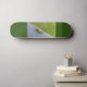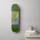 Um skate verde-escuro 7 3/4, com uma fotografia de um gafanhoto, sobre uma varanda.