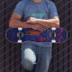 Mergulhe em uma viagem cósmica com este andar de skate psicodélico apresentando um crânio surreal derretendo com três olhos, brotando cogumelos vibrantes e lançando matizes de técnico numa galáxia giratória. Queimando com laranjas neonatais, púrpuras e azuis contra um cenário espacial estrelado, este design é perfeito para skatistas que desejam expressões ousadas e vibrações fora do mundo. Um imperativo para amantes da arte alucinogénica, gráficos de curvatura mental e caos cósmico.