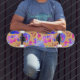 Quadro de skate de arte abstrato, roxo e cor-de-rosa, colorido, com nome personalizado em um roteiro de tipografia branca, com letra casual.