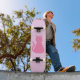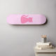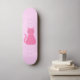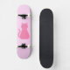 Este skate incrível apresenta uma imagem de arte digital de um gato rosa bonito com uma cauda encaracolada. Seus olhos são cor-de-rosa pálido com pupilas pretas e ela tem pestanas pretas longas. Ela está vestindo um arco rosa no cabelo e um lindo colar de pérolas ao redor do pescoço. A design é perfeita para celebrar uma menina.
