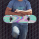 Este design holográfico de espiral líquido marmoreado iridescente apresenta uma mistura mesmerante de néon vibrante e cores pastéis. A imagem é trivial e distorcida, com efeito de difração de luz cativante, reminiscente do estilo vaporwave psicodélico dos anos 80-90.