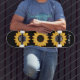 O skate Sunflower Floral Yellow Black Personalised Girls tem um design de arte legal de grandes girassóis amarelos e laranja sobre fundo preto. Personalize para qualquer cor que desejar. Personalizado com o nome em um script branco moderno, escrito à mão. Faz uma ideia de presente personalizada de excelente para uma garota que ama o campo e os girassóis. CLIQUE EM PERSONALIZAR OPÇÃO MODELO E DIGITE NOME