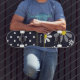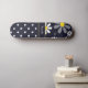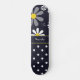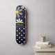 Um skate com um padrão de flor de modo giro retrô no topo com margaridas brancas com centros amarelos contra um fundo azul marinho, e um padrão de bolinhas azul e branco de tendência no fundo. Personalize adicionando seu nome. Presente perfeito para uma garota na moda.