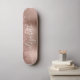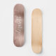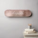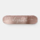 Tabuleiro de skate feminino personalizado com rosa dourado faux glitter gotejando contra um fundo de folhas metálicas falso em ouro rosa. Monograma com seu nome em um roteiro branco de na moda com baloiços.