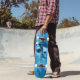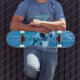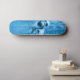 Gritar crânios azuis em um fundo de tijolos resfriados é um design de skate malvado que todos adorarão.