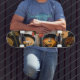 Uma parede com as guitarra do vintage que penduram na exposição.