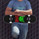 Um motivo de gato com aparência ligeiramente psicopata com "Killer Kitten" escrito embaixo de um sistema de grafite áspero em vermelho com um gato verde sobre fundo preto.