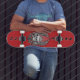 O crânio rei com a coroa e as asas de penas é colocado sobre um fundo vermelho com texto do SKATE KING.