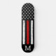 Bordo fino da linha vermelha - bandeira americana em cores de bandeira de bombeiro, design angustiado. Personalize este skate de bombeiros com um monograma inicial. Este andar personalizado de skate de bombeiros é perfeito para bombeiros, bombeiros, bombeiros graduados e presentes de aposentadoria. COPYRIGHT © 2020 Judy Burrows, Black Dog Art - Todos Os Direitos Reservados. Tabuleiro de bordo fino da linha vermelha do bombeiro personalizado