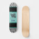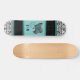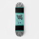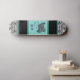 This Polynesian beach theme skateboard features intricate ink style retro artwork of a manta ray against a light teal green faux brushed metal background, bordered with a black and white pattern. The manta ray is rendered in an intricate, stylized line-drawing technique reminiscent of vintage New Zealand Maori art, giving it a bold and contemporary look. Your initials appear in black underneath the manta ray.