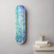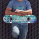 Marca skateboard Dd, com obra de arte gráfica de madeira manchada azul e verde em estilo grunge com estênceis florais. Personalize para adicionar seu próprio texto.