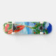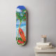 Boas festas dos Sandy Beach mornos de sua praia tropical favorita da ilha. Palmeira decorada com enfeites de natal e luzes, com uma prancha retro que inclina-se contra a árvore de Natal.