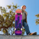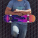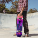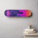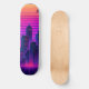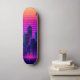 Uma paisagem urbana retrógrada com brilho neon, arranha-céus torrenciais e palmeiras tropicais contra um sol gigante. Esta arte combina a estética da onda sintetizada dos anos 80 com as vibrações futuristas.
