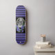 skate de marca Dd, feito em preto e roxo, com gráficos de uma noiva esquelética com flores roxas, no meio do conselho. Ambas as extremidades do conselho são feitas em um padrão listrado roxo e preto.