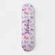 Um skate de nome personalizado de macarões bonitos. O skate faz uma ideia de presente de excelente para uma garota que ama macarões e skate. O conselho é projetado com pequenas macaronas roxas brilhantes e cor-de-rosa legal. Personalizado com o nome em caracteres azuis de escrita de caligrafia na área direita do conselho. CLIQUE EM PERSONALIZAR OPÇÃO MODELO E DIGITE NOME.