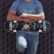 Este é de um tipo de skate porque foi projetado por você usando nosso modelo de "Cavaleiro da Noite". Substitua a chama pelo seu próprio rosto e adicione seu nome e outro texto.