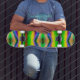 Este design lembra-me um olho de réptil no meio. Abstrato com cores primárias de verde limão, vermelho-amarelo e roxo-azulado.