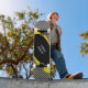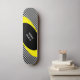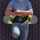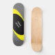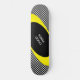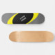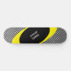Padrão de xadrez preto-e-branco, linhas onduladas amarelas com centro preto e skate caligrafia.