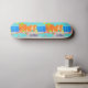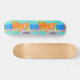 Entre! A água está boa! Este skate de Piscina retrô apresenta um desenho animado e vibrante repetido de uma divertida e sofisticada festa de piscina. O design moderno do meio século se concentra em torno de uma piscina de natação redonda em uma cinza grande e concreta. A piscina está cheia de água turquesa. A alvenaria laranja rodeia a piscina e há um conselho branco, de mergulho em prancha pronto para uma alma aventureira. Uma bola de praia vermelha e branca está flutuando na água. Do lado oposto da piscina, dois partidários estão pendurados na água, enquanto descansam em toalhas de praia listradas e vermelhas. A mulher de cabelo preto está vestindo um maiô rosa e de uma peça. Ao lado dela está uma bebida tropical em um coco com um pequeno guarda-chuva e uma palha verde. O louro está vestindo troncos brilhantes e verdes. Ele é chutado com as mãos atrás da cabeça. À esquerda da piscina, está um homem distinto com cabelos brancos e troncos de natação de jade segurando uma bebida em uma casca de coco. Sabemos que ele é distinto porque é um homem de cabelo branco! Ele está falando com uma mulher de cabelos loiros e uma figura de ampulheta vestindo um maiô de turquesa. Atrás desta cena está a silhueta verde de uma palmeira e uma casa futurista, laranja, de tijolos. Através das janelas grandes, do chão ao teto, de vidro azul, você pode ver a silhueta de uma televisão, cadeira, otomano e relógio de starburst. O céu atrás da casa é uma turquesa sem nuvens com um sol redondo, amarelo.