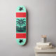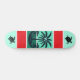 Custom skateboard featuring a dramatic palm tree and tropical island silhouette against vintage dark green, light green, and red stripes. Turtle silhouettes grace the top and bottom of this beach theme skateboard. Your or your recipient's initial monogram appears in green against the palm tree. Make sure to type your initial to replace the placeholder sample in the Peronalize section.