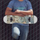 La patineta presenta un diseño poético con un par de golondrinas volando en medio del invierno, plasmadas de manera delicada sobre la tabla. Las aves en vuelo capturan la gracia y la libertad, contrastando con el trasfondo invernal. Este diseño no solo agrega un toque artístico a la patineta, sino que también evoca una sensación de movimiento y ligereza, convirtiéndola en una expresión visualmente cautivadora y simbólica de la naturaleza y la temporada invernal.