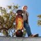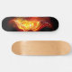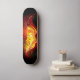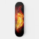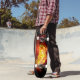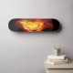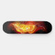 Pena de pavão brilhante feita de fogo e chamas sobre fundo negro.