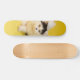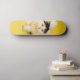 La patineta presenta un diseño específico, representando a un gato de la raza persa caminando. La imagen en la patineta retrata al felino con detalles que reflejan su raza, como su distintivo pelaje largo y facial achatado. La elección de un gato persa y la pose dinámica sugieren una representación animada y lúdica en la patineta, lo que podría añadir un toque de diversión y personalidad al objeto.