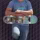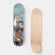 Um andar de skate com dois gatos becos: um gato de skate em calções e camisas de conselho, e um gengibre com latas de spray, desenhando grafite na parede atrás.