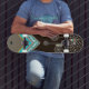 O skate de marca Dd, feito no Sudoeste, inspirou cores marrom, bronzeado, turquesa e coral. Gráficos de uma caçadora de sol e penas decoram o conselho. O apanhador de vento, em texto branco personalizado, pode ser personalizado para ler o que você quer.