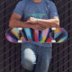 Step into a world of vibrant energy with this statement skateboard design from the "Radio Waves and Sunrays Art Deco Collection." This design features a dynamic, painterly explosion of color that radiates from a central point, creating an abstract sunburst or a spinning color wheel. Streaks of red, blue, yellow, orange, and pink blend and overlap in visible brushstrokes, giving the pattern a unique, artistic feel. The vertical lines of the radiating colors are perfectly placed. They are the perfect way to add a pop of prismatic color and artistic flair to your activity.