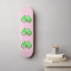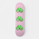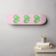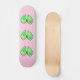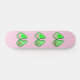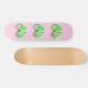 Este skate incrível apresenta uma imagem gráfica de uma vagem verde de Ervilha contendo 2 ervilhas verdes e uma ervilha rosa grande. A ervilha rosa grande tem um rosto bonito com olhos e boca. Do outro lado da ervilha, em texto cor-de-rosa mais escuro, está escrito "Baby Girl Ready to Pop". A design é ideal para um anúncio de gravidez, revelação de gênero ou chá de fraldas. Há um grupo de pequenas ervilhas rosa no fundo.