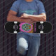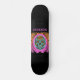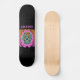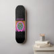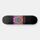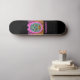 Um arrojado no seu rosto dia sombrio do skate morto personalizado com o crânio de açúcar pintado em laranja, turquesa e rosa quente, num fundo de quadro com uma fonte peculiar.