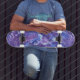 Cores e formas roxas e azuis num skate para formar um design extraordinário.